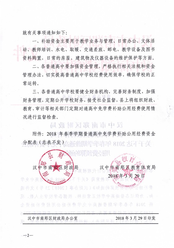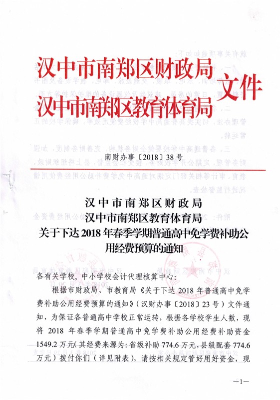 南财办事〔2018〕38号 关于下达2018年春季学期普通高中免学费补助公用经费预算的通知