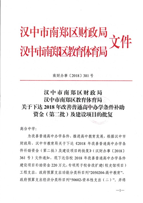 南财办事〔2018〕381号 关于下达2018年改善普通高中办学条件补助资金(第二批)及建设项目的批复