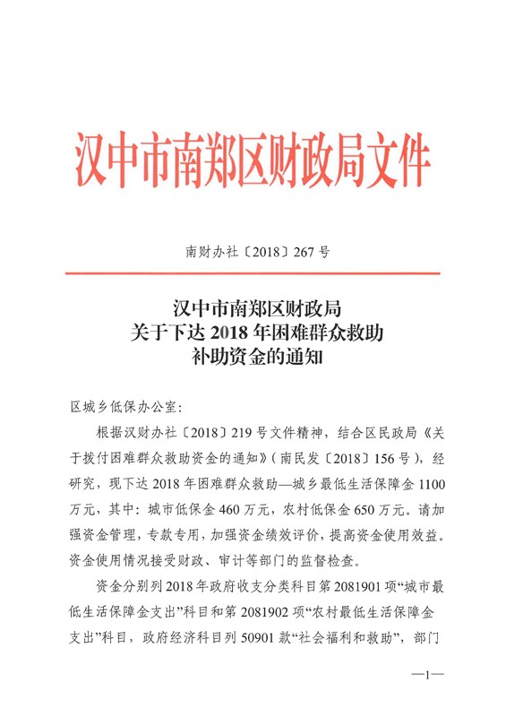南财办社〔2018〕267号,关于下达2018年困难群众救助补助资金的通知