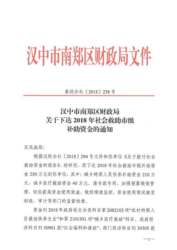 南财办社〔2018〕258号,关于下达2018年社会救助市级补助资金的通知