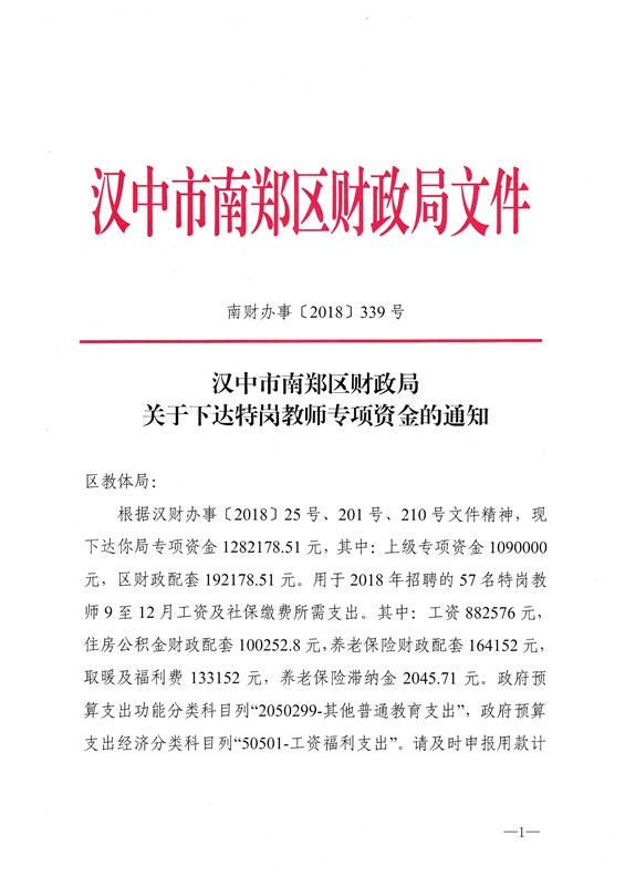 南财办事〔2018〕339号 关于下达特岗教师专项资金的通知