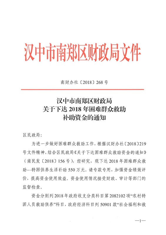 南财办社〔2018〕268号,关于下达2018年困难群众救助补助资金的通知