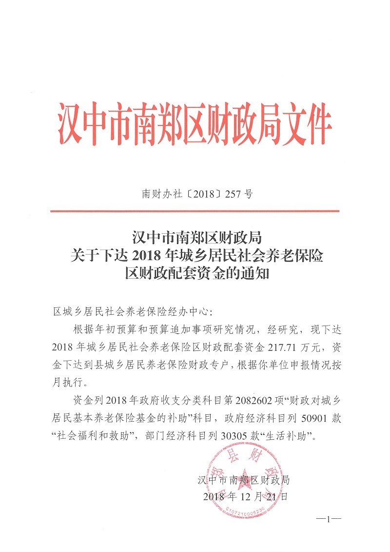 南财办社〔2018〕257号,关于下达2018年城乡居民基本养老保险区财政配套资金的通知