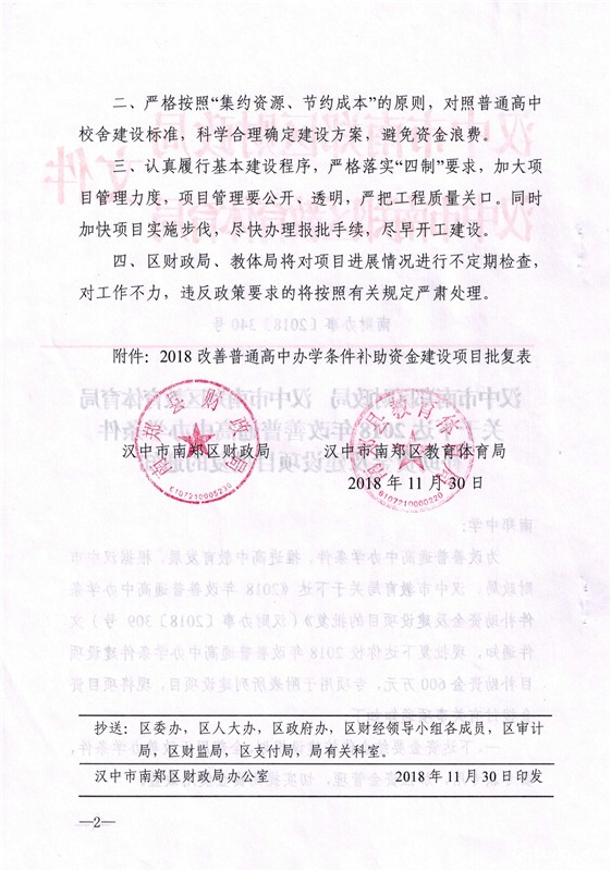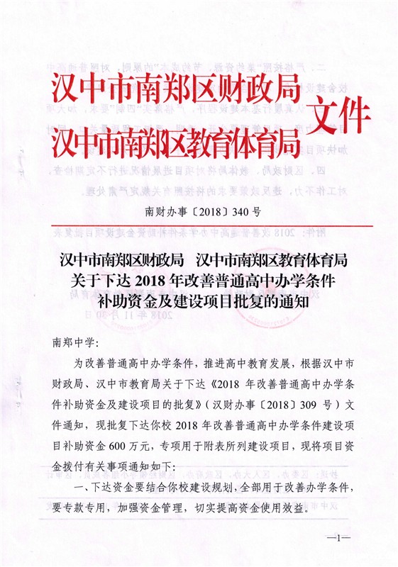 南财办事〔2018〕340号 关于下达2018年改善普通高中办学条件补助资金及建设项目批复的通知