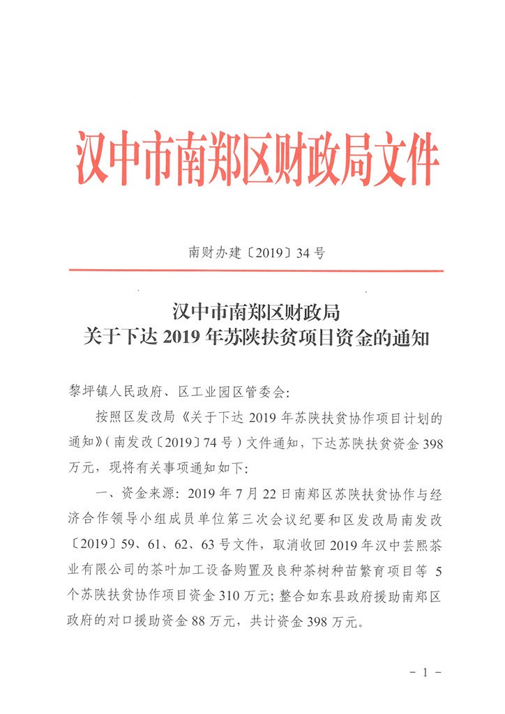 南财办建[2019]34号 关于下达2019年苏陕扶贫项目资金的通知