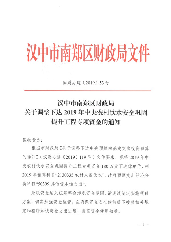 关于调整下达2019年中央农村饮水安全巩固提升工程专项资金的通知
