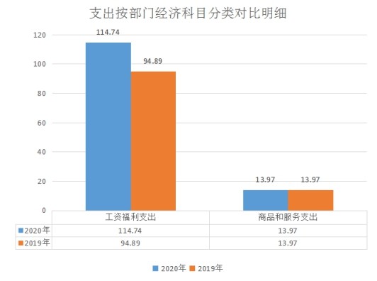 2020年本部门一般公共预算拨款支出128.71万元,较上年108.86万元增加19.85万元,增长18.23%,主要原因一是人员工资正常晋升;二是将原由财政代列的住房公积金、养老保险等配套部分列入本部门预算收入。