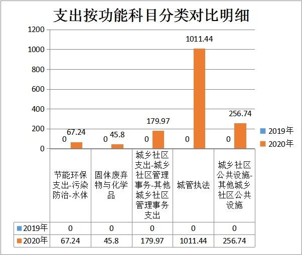 <4>城管执法(2120104)1011.44万元,较上年增加1011.44万元,上升比率100%,主要原因是因机构改革,南郑区城市管理局属于新组建单位,从南郑区住建局划拨7个下属单位到南郑区城市管理局,致使本年城管执法支出增加。