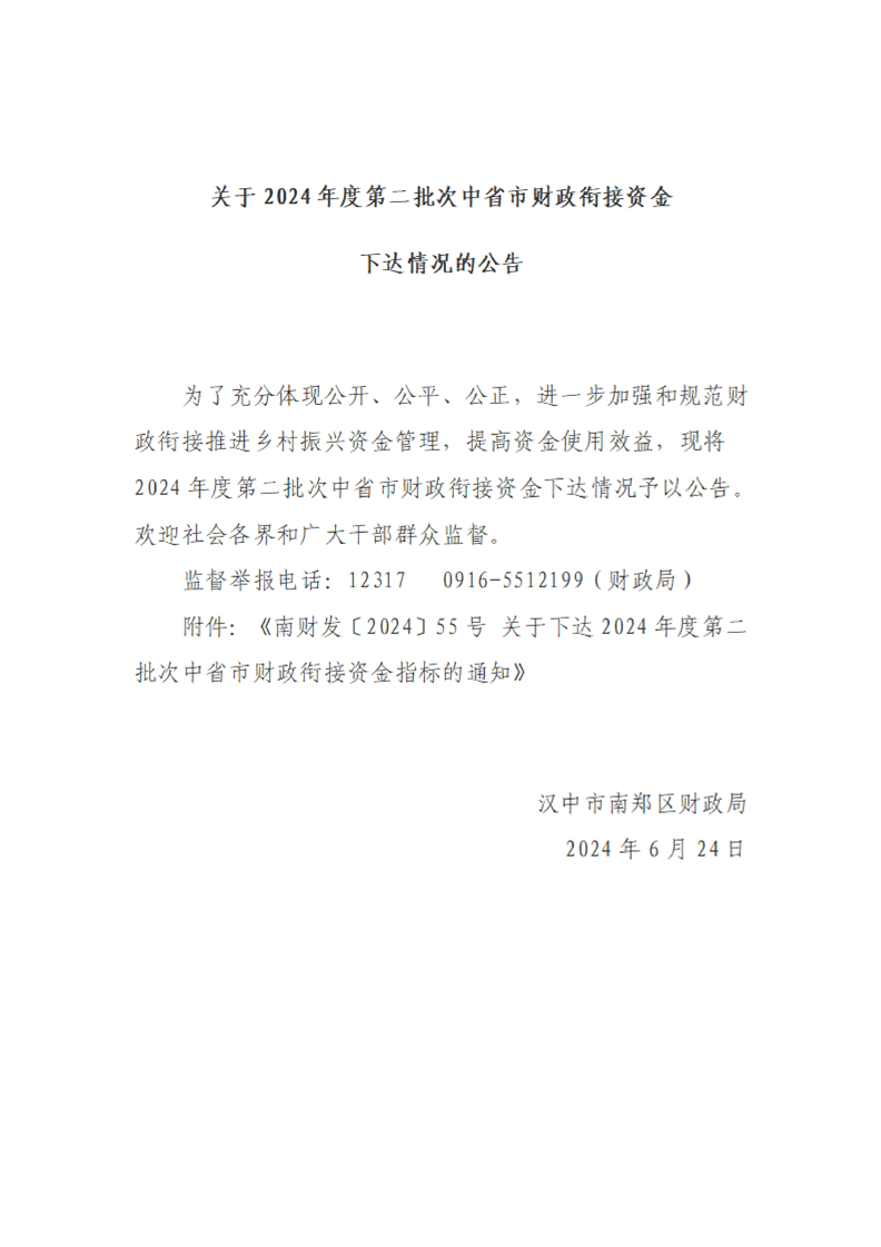关于2024年度第二批次中省市财政衔接资金下达情况的公告