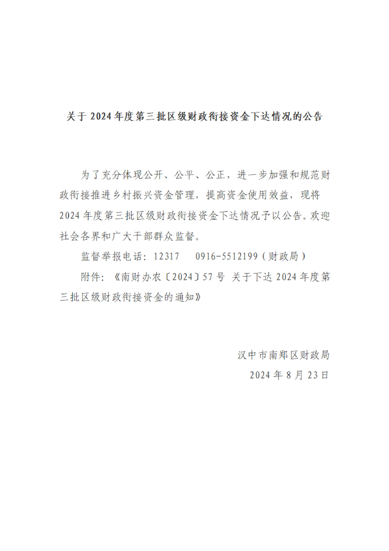 关于2024年度第三批区级财政衔接资金下达情况的公告