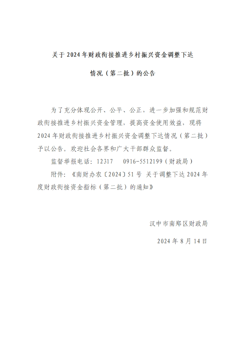 关于2024年财政衔接推进乡村振兴资金调整下达情况(第二批)的公告
