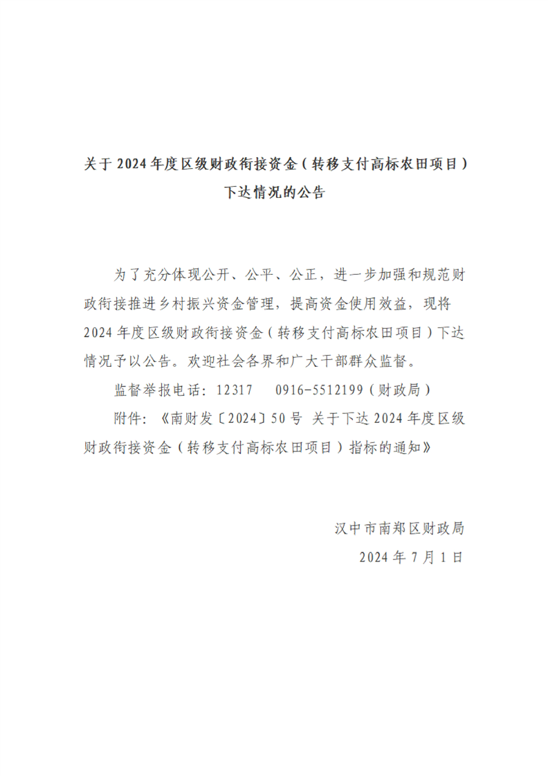 关于2024年度区级财政衔接资金(转移支付高标农田项目)下达情况的公告