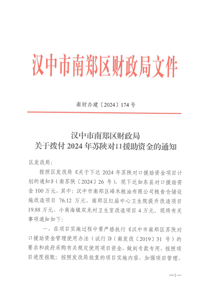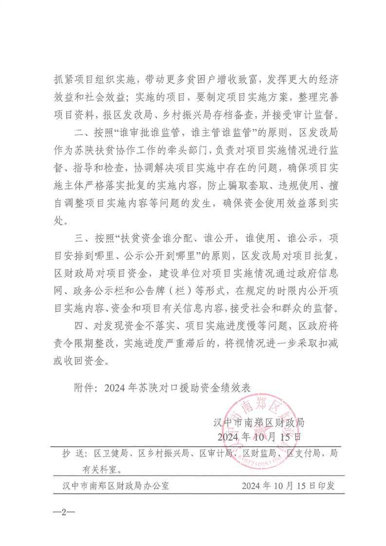 汉中市南郑区财政局关于拨付2024年苏陕对口援助资金的通知
