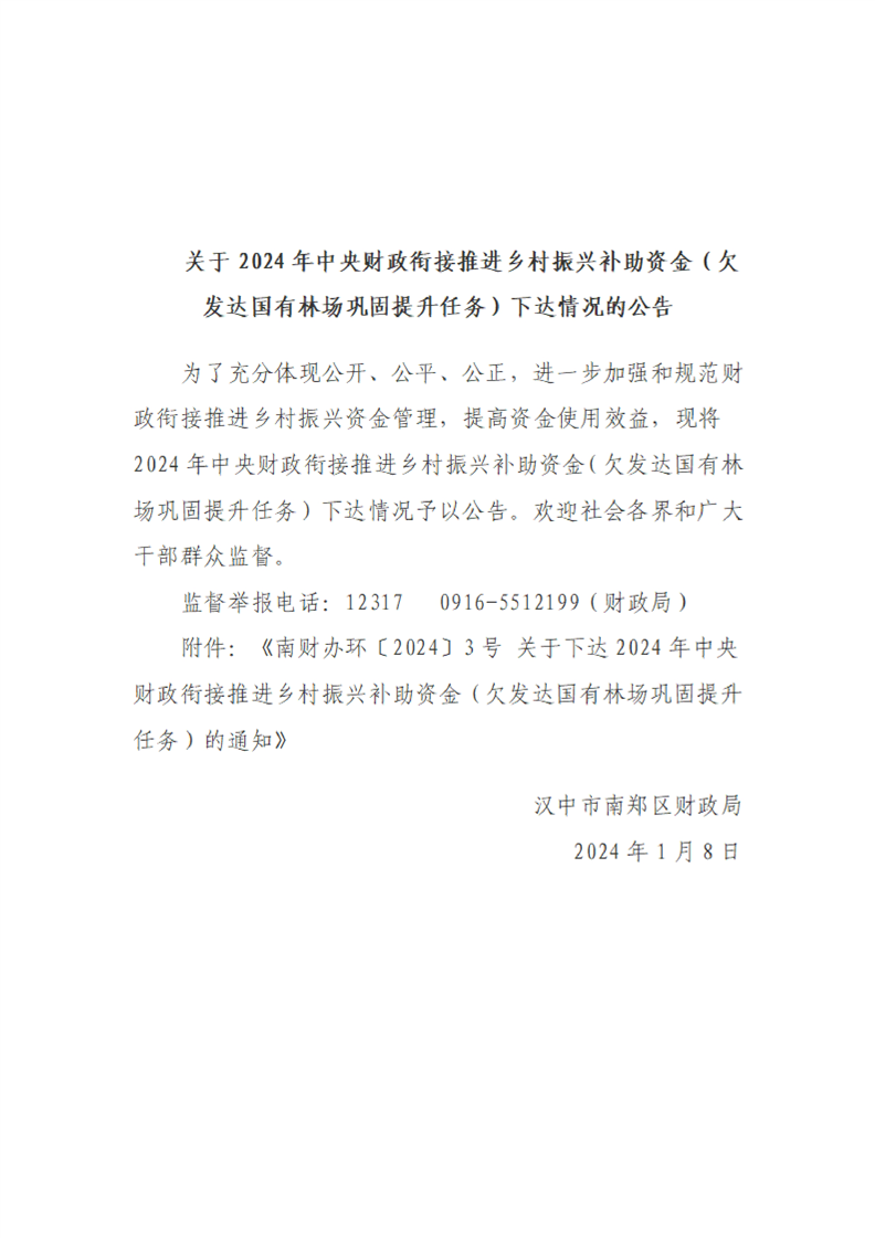 关于2024年中央财政衔接推进乡村振兴补助资金(欠发达国有林场巩固提升任务)下达情况的公告