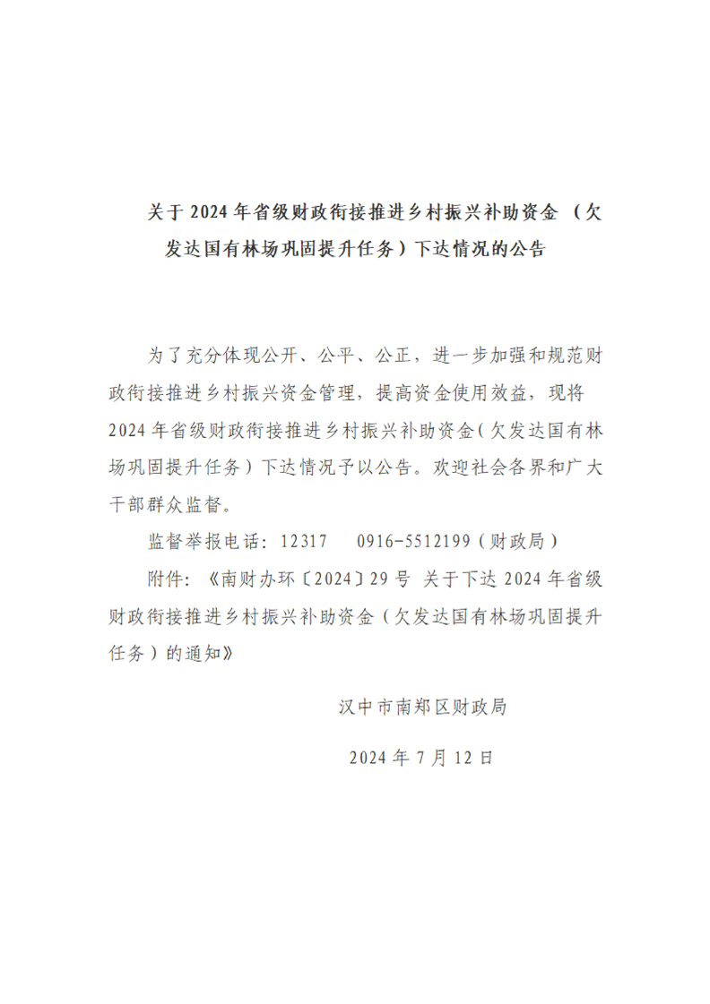 关于2024年省级财政衔接推进乡村振兴补助资金 (欠发达国有林场巩固提升任务)下达情况的公告