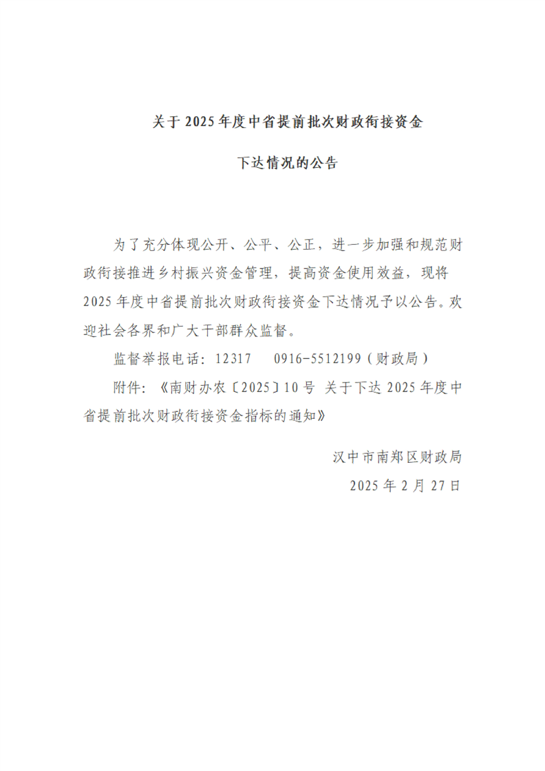 关于2025年度中省提前批次财政衔接资金下达情况的公告
