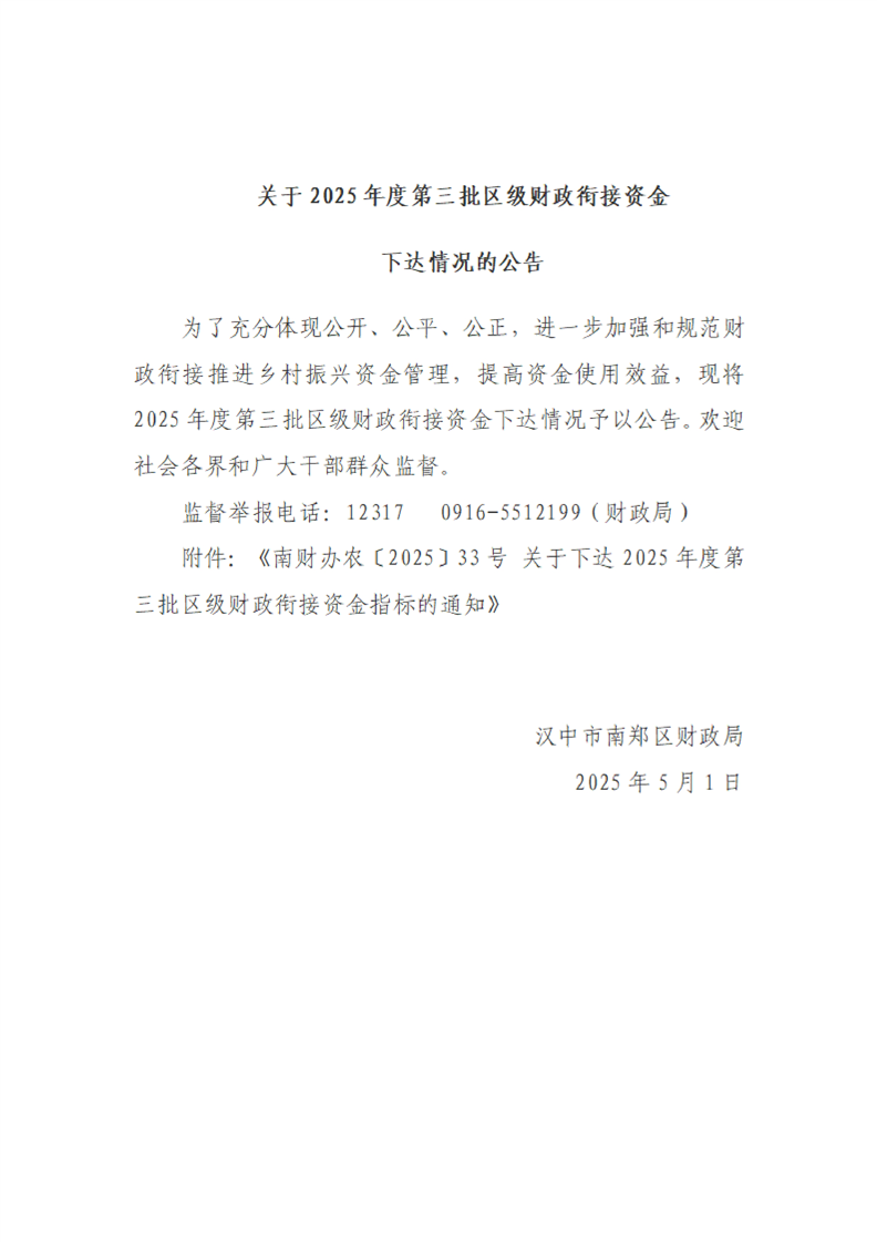 关于2025年度第三批区级财政衔接资金下达情况的公告