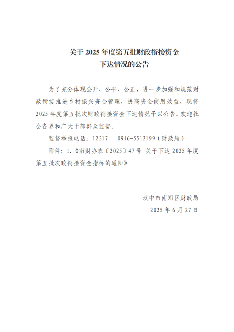 关于2025年度第五批财政衔接资金下达情况的公告