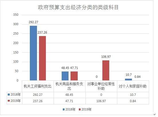 机关工资福利支出(501)237.26万元,较上年292.27万元减少55.01万元,下降18.82%。原因是2018年区普法教育中心列入行政运行,现规范科目,将区普法教育中心调整为事业运行。