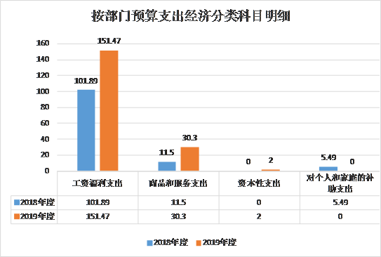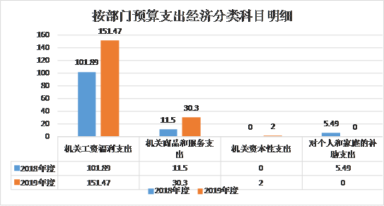 2019年本部门预算支出183.77万元,较上年同期预算支出118.88万元相比增加64.89万元,增幅 54.6%,主要原因一是将上年财政代列的在职医疗和养老补贴、住房公积金等单位配套部分列入本部门人员经费预算;二是专项工作任务增加,从而专项经费增加;三是新增工作人员5人,人员经费、公用经费增加。