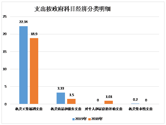 2019年本部门一般公共预算支出33.67万元,其中:人员经费 22.34万元,公用经费3.33万元,专项业务经费8万元,按照部门预算支出经济分类的类级科目说明如下: