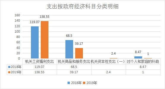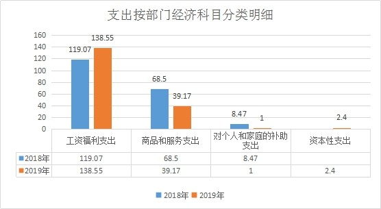 2019年本部门一般公共预算拨款支出181.12万元,与上年度一般公共预算拨款支出196.04万元相比,减少14.92万元,减少7.6%,主要原因是公用经费减少和项目减少所致。