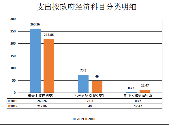 工资福利支出(301)260.26万元,与2018年工资福利支出217.86万元相比,增加42.4万元,增长19.46%,原因是人员工资调标和正常晋升,原来由财政代列的住房公积金、养老保险等列入本部门人员经费预算所致。