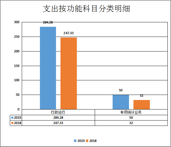 行政运行(统计信息事务2010501)284.28万元,与2018年247.33万元相比,增加了36.95万元,增长14.94%,主要是由于预算口径及科目调整,将原列入人员经费的公务交通补贴列入2019年公用经费预算。