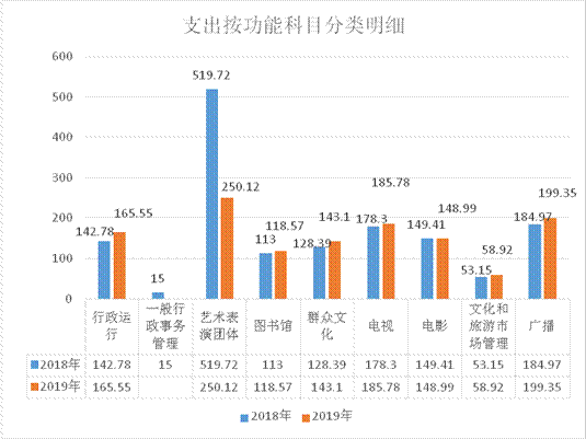 3)艺术表演团体(2070107250.12万元,较上年艺术表演团体519.72万元相比,减少269.6万元,原因是2019年桄桄剧团艺术班演职人员劳务费专项资金列入财政切块资金;