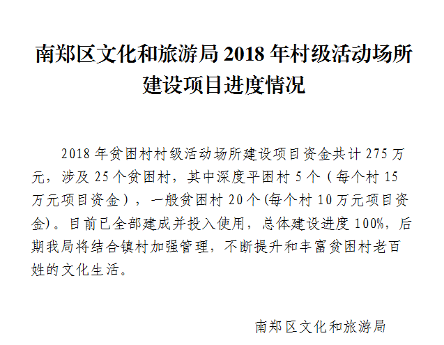 南郑区文化和旅游局2018年使用债券存续期公开项目建设进度情况