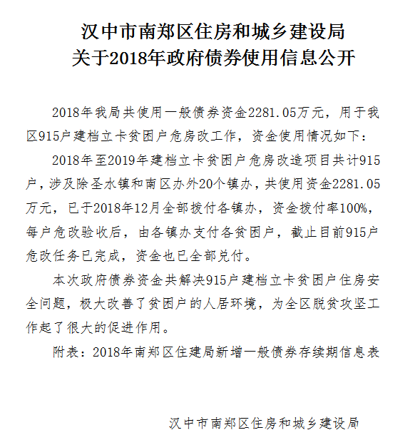 南郑区住房和城乡建设局关于2018年政府债券使用信息公开