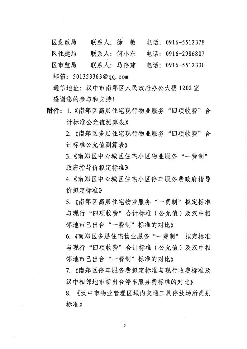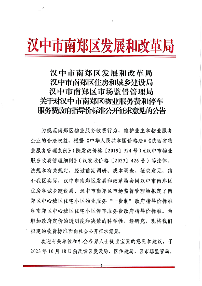 汉中市南郑区发展和改革局汉中市南郑区住房和城乡建设局汉中市南郑区市场监督管理局关于对汉中市南郑区物业服务费和停车服务费政府指导价标准公开征求意见的公告