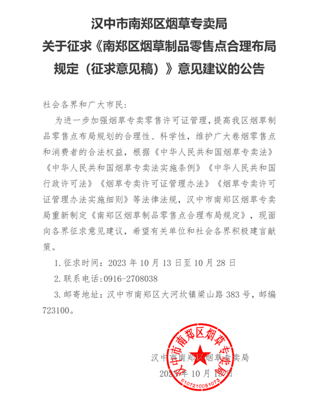 汉中市南郑区烟草专卖局关于征求《南郑区烟草制品零售点合理布局规定(征求意见稿)》意见建议的公告