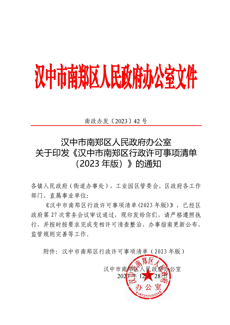 汉中市hth网页版下载办公室关于印发《汉中市南郑区行政许可事项清单(2023年版)》的通知