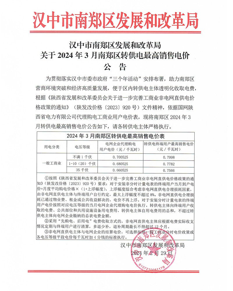 汉中市南郑区发展和改革局关于2024年3月南郑区转供电最高销售电价公告
