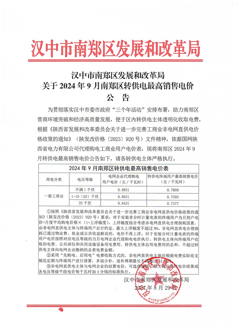 汉中市南郑区发展和改革局关于2024年9月南郑区转供电最高销售电价公告