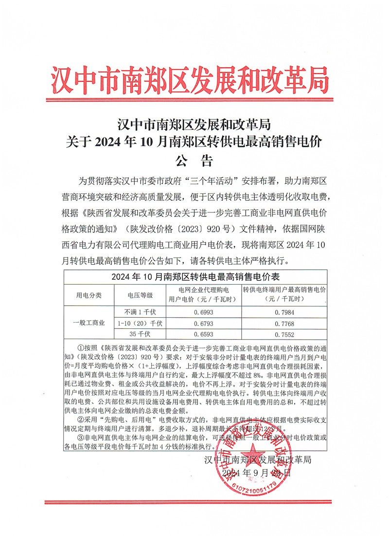 汉中市南郑区发展和改革局关于2024年10月南郑区转供电最高销售电价公告
