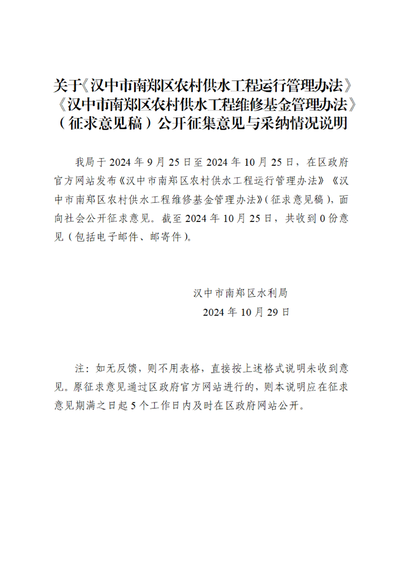 关于《汉中市南郑区农村供水工程运行管理办法》《汉中市南郑区农村供水工程维修基金管理办法》(征求意见稿)公开征集意见与采纳情况说明