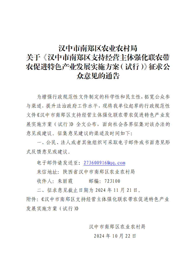 汉中市南郑区农业农村局关于《汉中市南郑区支持经营主体强化联农带农促进特色产业发展实施方案(试行)》征求公众意见的通告