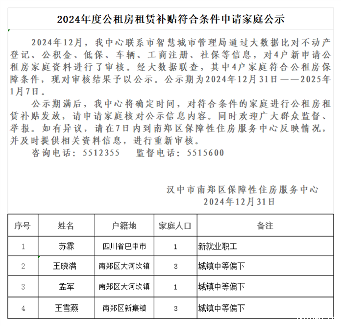 2024年度公租房租赁补贴符合条件申请家庭公示
