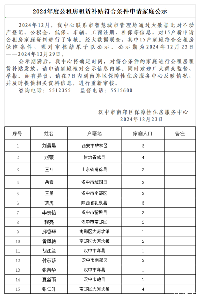 2024年度公租房租赁补贴符合条件申请家庭公示