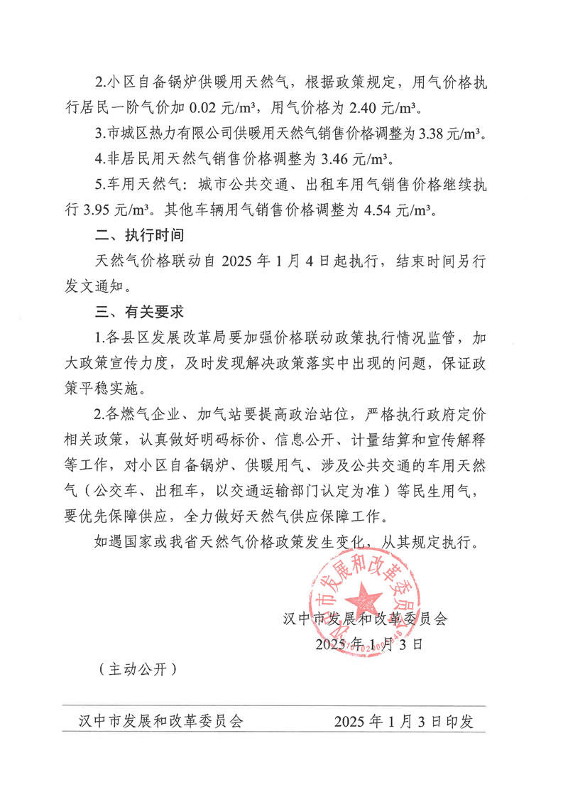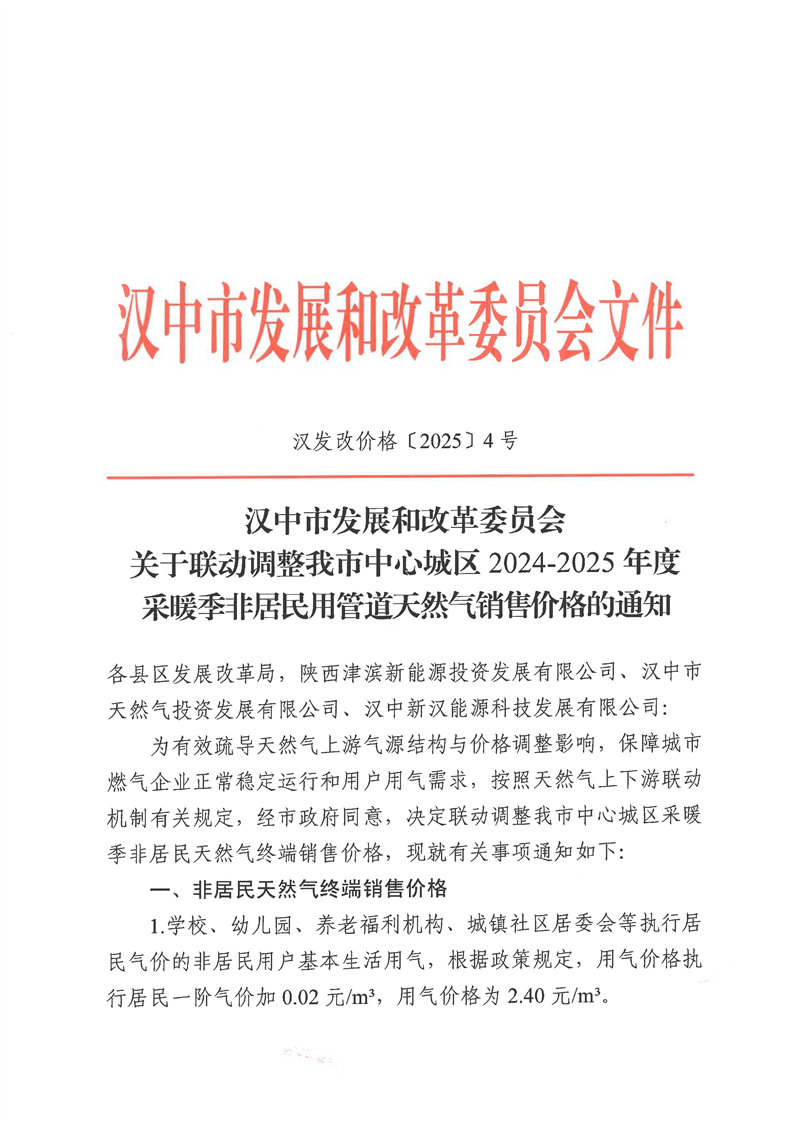 汉中市发展和改革委员会关于联动调整市中心城区非居民天然气销售价格的通知(汉发改价格[2025]4号)