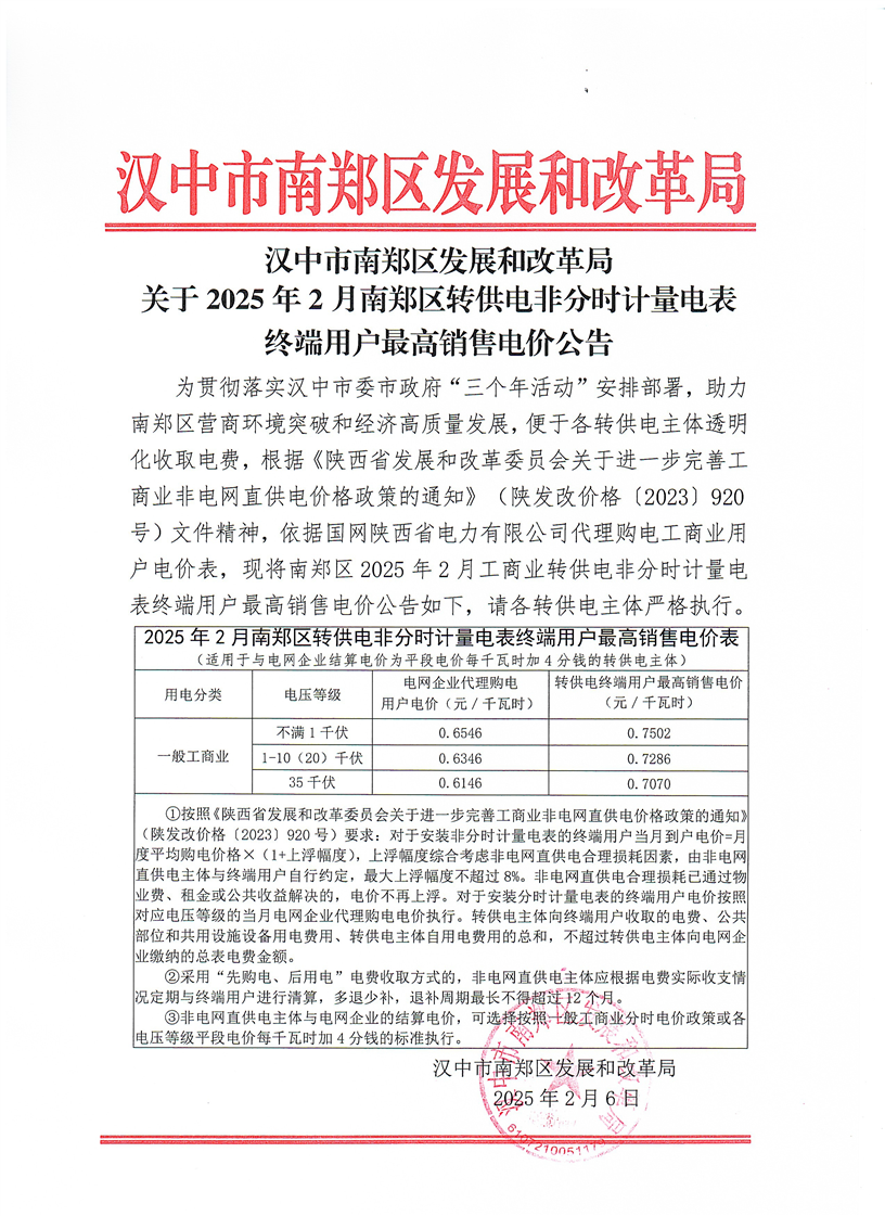 关于2025年2月南郑区转供电非分时计量电表终端用户最高销售电价公告