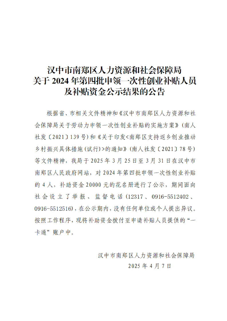 汉中市南郑区人力资源和社会保障局关于2024年第四批申领一次性创业补贴人员及补贴资金公示结果的公告