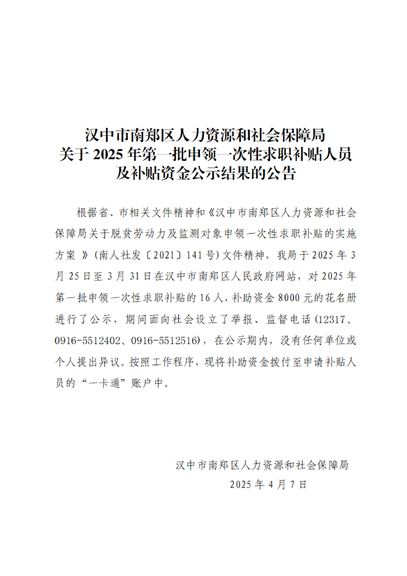 汉中市南郑区人力资源和社会保障局关于2025年第一批申领一次性求职补贴人员及补贴资金公示结果的公告