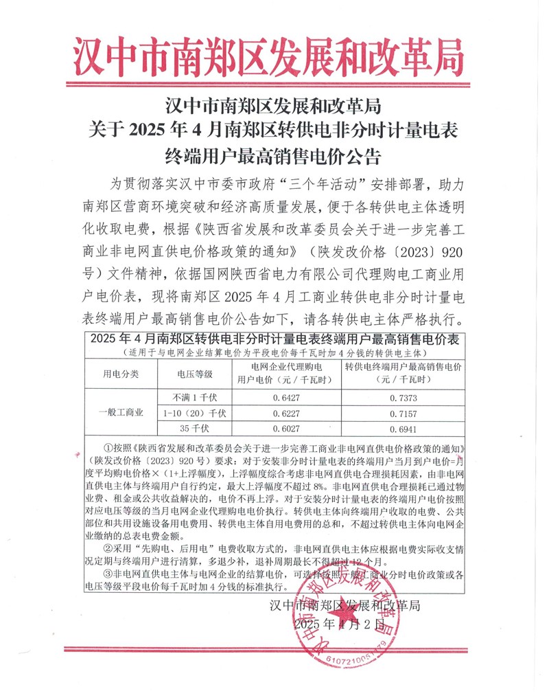关于2025年4月南郑区转供电非分时计量电表终端用户最高销售电价公告