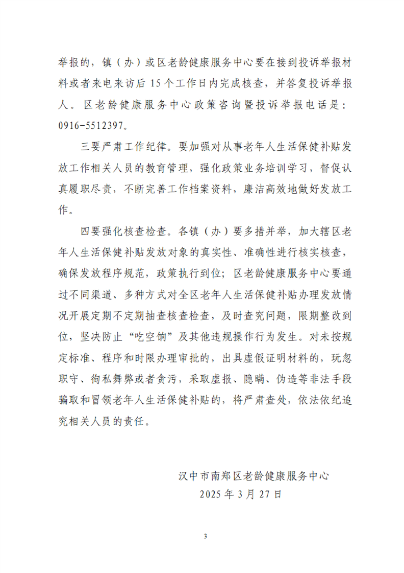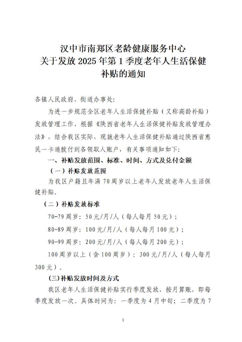 汉中市南郑区老龄健康服务中心关于发放2025年第1季度老年人生活保健补贴的通知