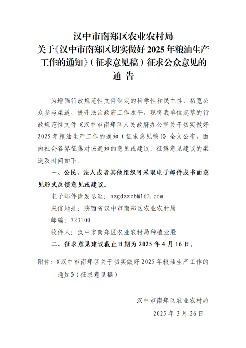 汉中市南郑区农业农村局关于《汉中市南郑区切实做好2025年粮油生产工作的通知》(征求意见稿)征求公众意见的通告