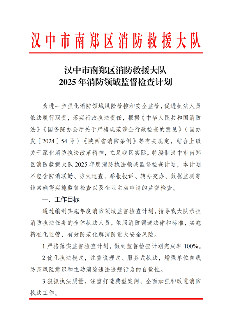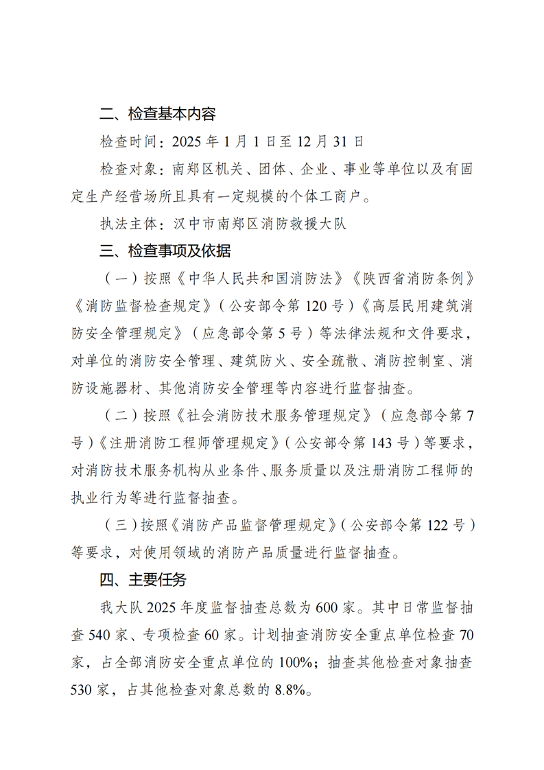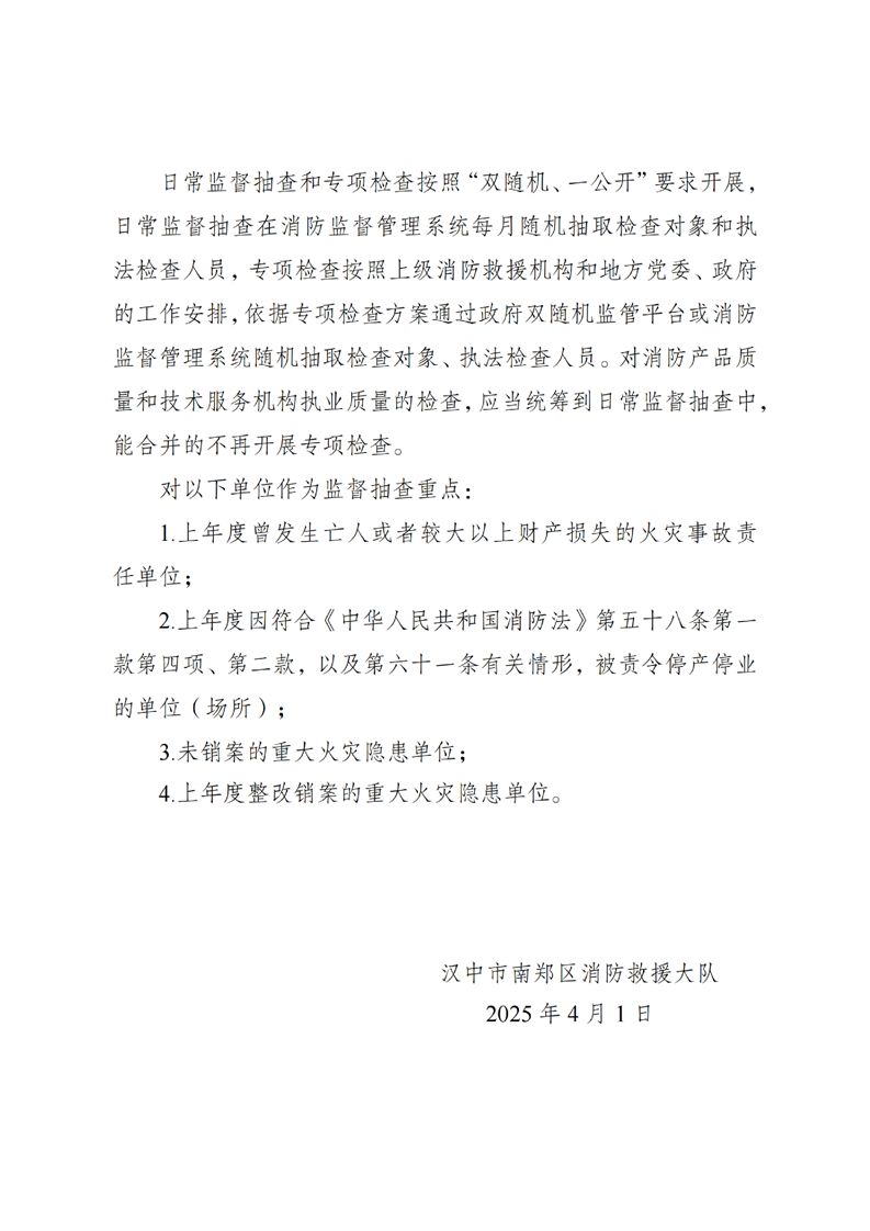 汉中市南郑区消防救援大队2025年消防领域监督检查计划