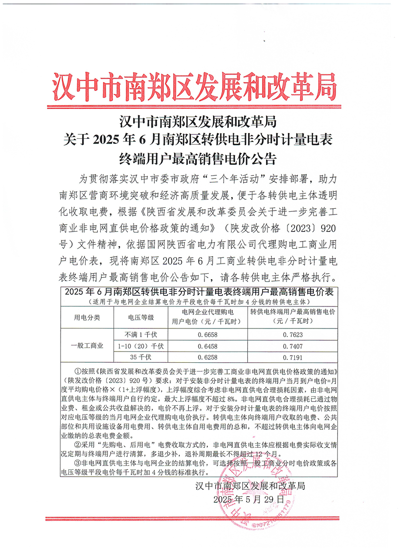关于2025年6月南郑区转供电非分时计量电表终端用户最高销售电价公告